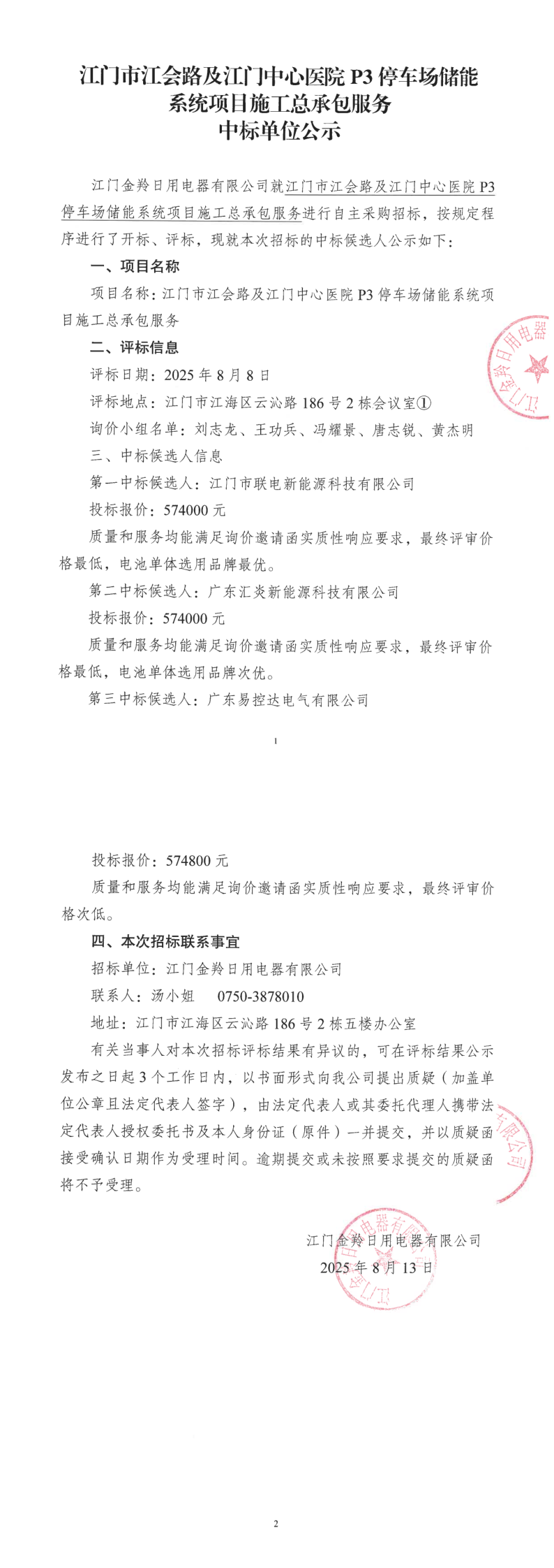 江门市江会路及江门中心医院P3停车场储能系统项目施工总承包服务中标单位公示