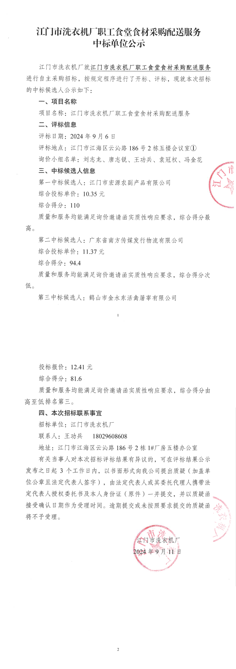江门市洗衣机厂职工食堂食材采购配送服务中标单位公示