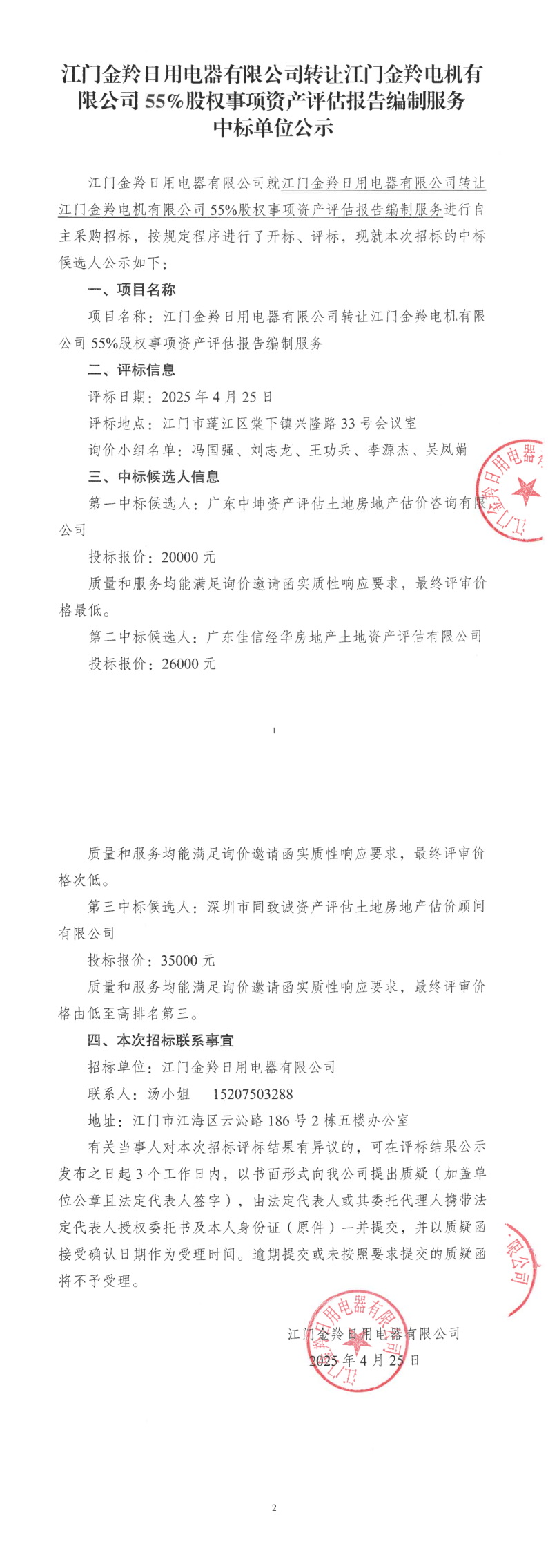 江门金羚日用电器有限公司转让江门金羚电机有限公司55%股权事项资产评估报告编制服务中标单位公示