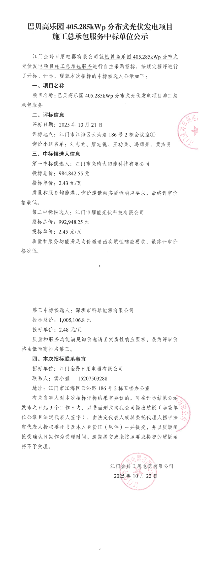 巴贝高乐园405.285kWp分布式光伏发电项目施工总承包服务中标单位公示