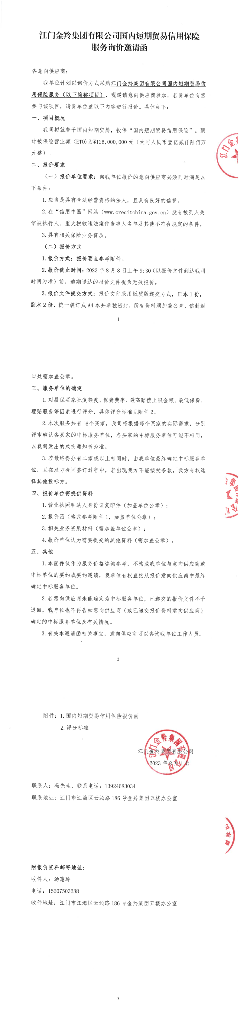 江门金羚集团有限公司国内短期贸易信用保险服务询价邀请函