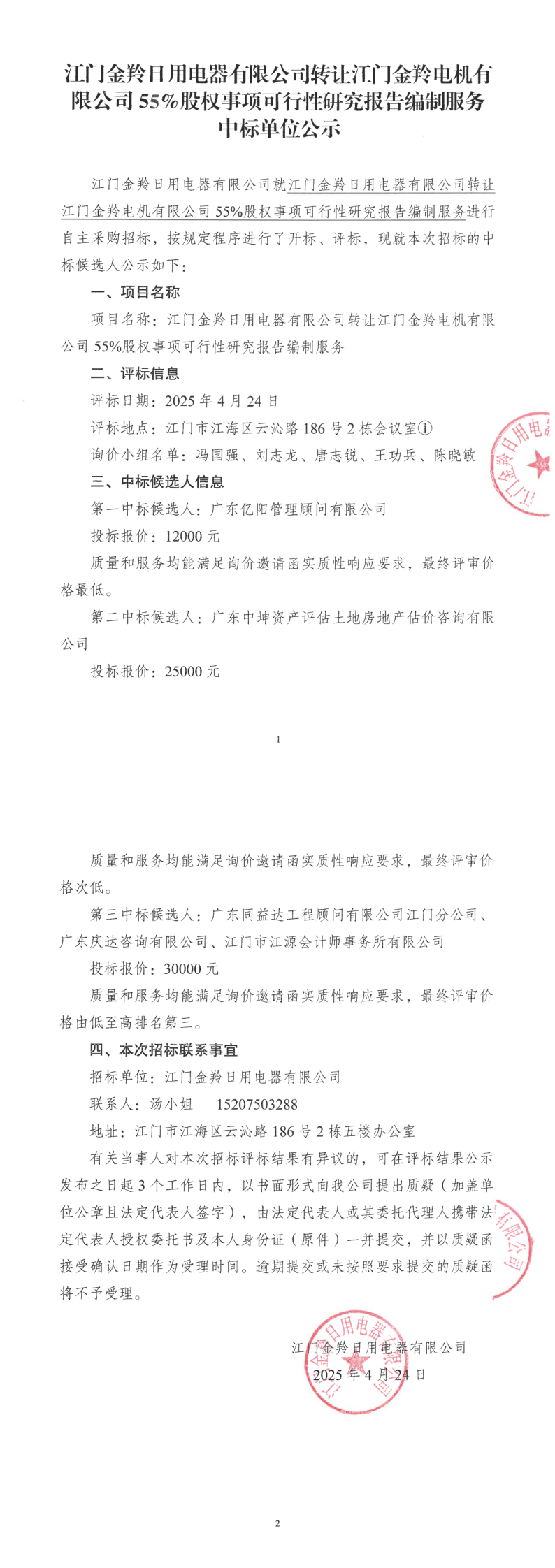 江门金羚日用电器有限公司转让江门金羚电机有限公司55%股权事项可行性研究报告编制服务中标单位公示