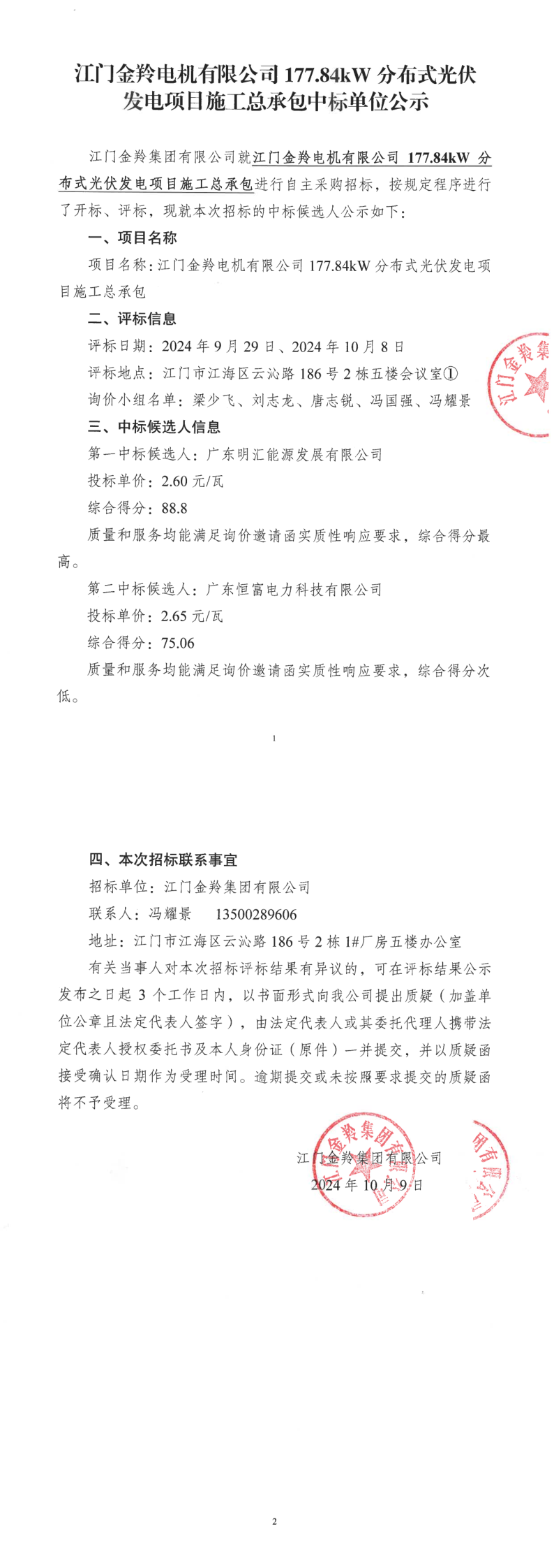 江门金羚电机有限公司177.84kW分布式光伏发电项目施工总承包中标单位公示