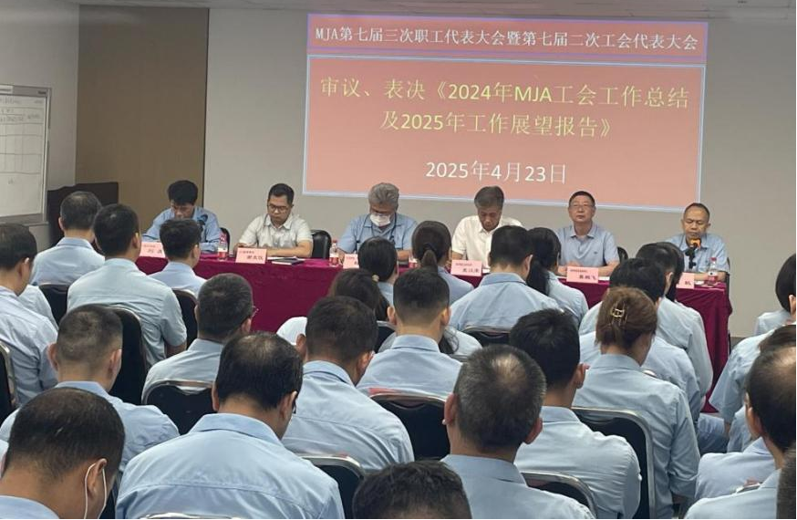 经全体代表审议,大会表决通过了《2024年MJA工作报告》《2024年MJA工会工作报告》《2024年MJA工会经审工作报告》等多项决议。大会充分肯定了工会工作成效,并由总经理松田圭代表行政方,工会主席伍敏代表工会,共同签订《集体合同》《女职工权益保护专项集体合同》和《工资集体协议》等。